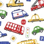 It’s a busy day in the neighborhood! Cars, buses, and trucks zoom along in a 36” activity panel, decorative stripe, and coordinating allover prints. A sure favorite for toddler quilts and bedroom/nursery décor. ©Nicole DeCamp